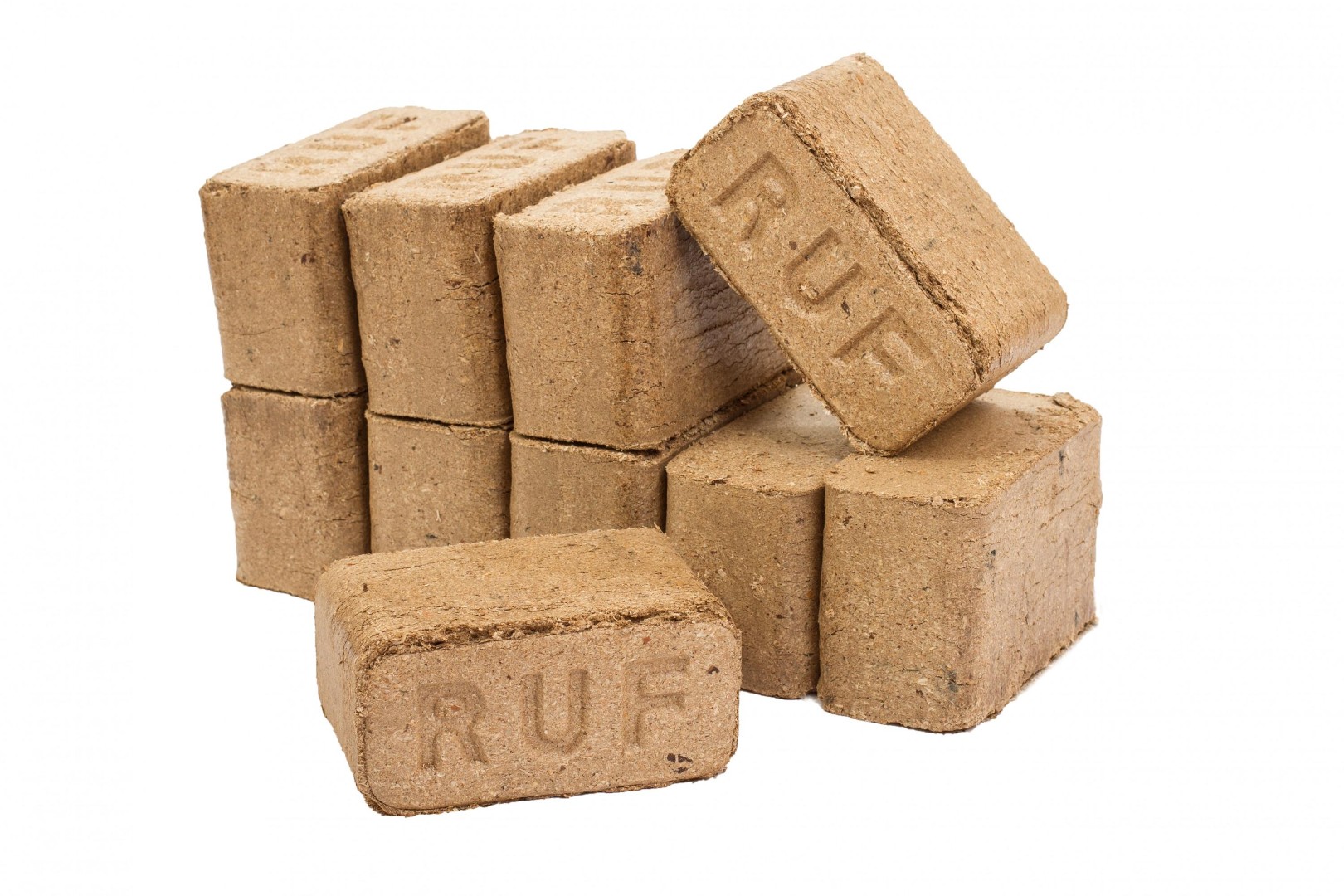 Топливные брикеты РУФ получены из хвои 80% и берёзы 20%. Эти топливные брикеты имеют форму своеобразного "кирпича". Топливный брикет RUF ровно и эффективно горит, обладает высокой теплотворностью, практически полностью сгорает (с образованием золы не более 0,3% от веса). Кроме того, для топливных брикетов характерно малое дымообразование.